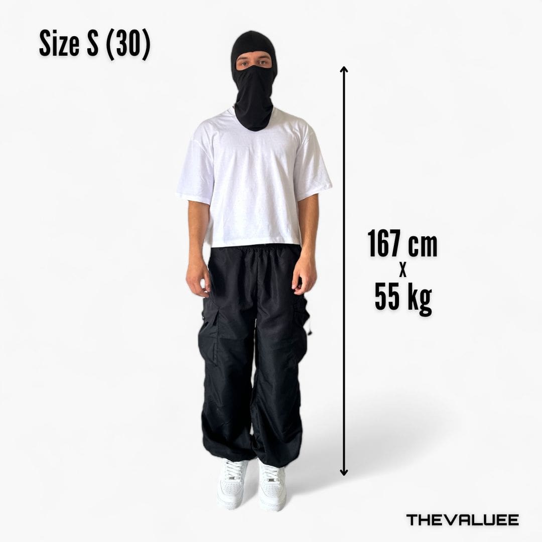 Our model on TikTok is 167 cm tall, weighs 55 kg and of the Black Tech Parachute model wears size S (30).