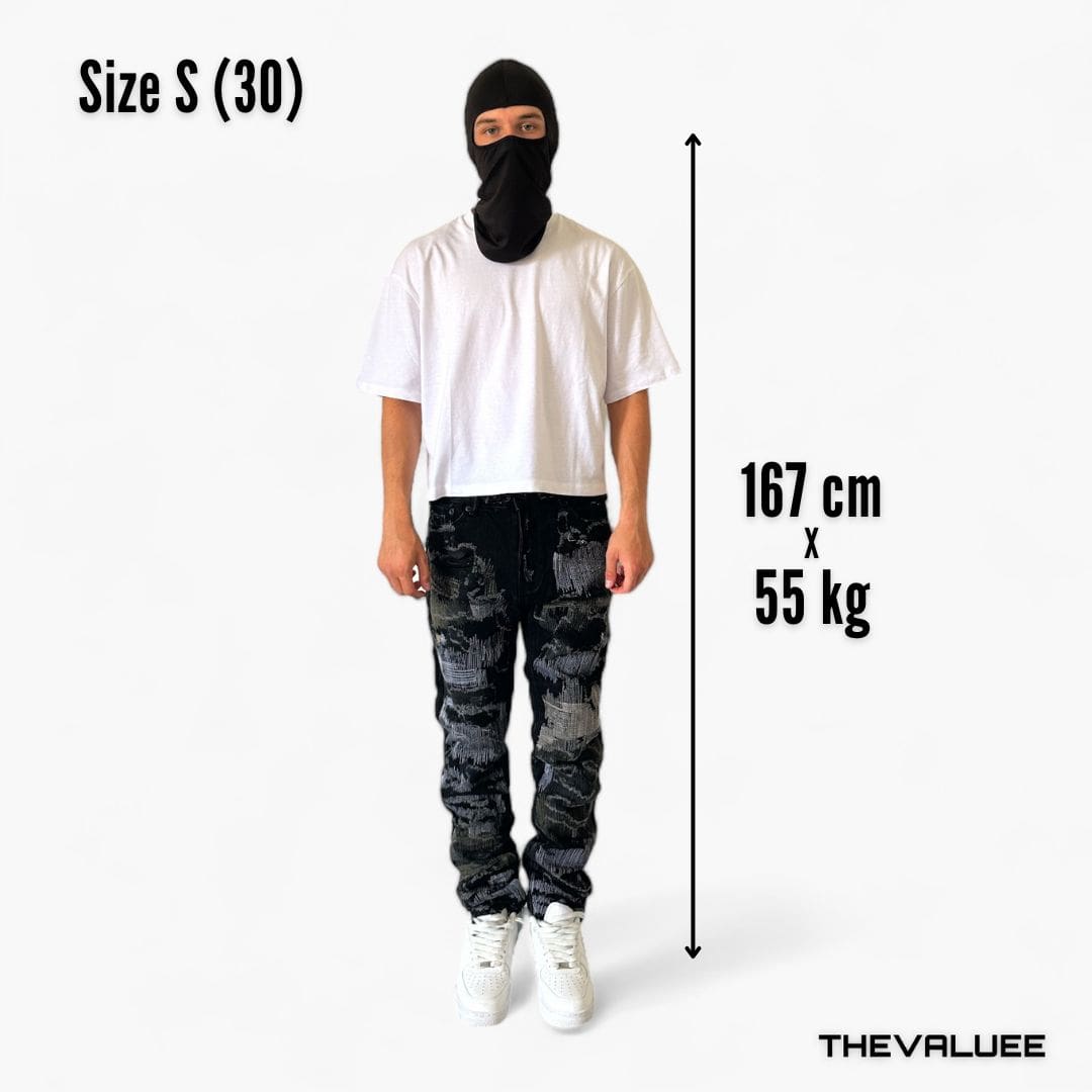 Our model on TikTok is 167 cm tall, weighs 55 kg and of the Distressed Black Jeans and Distressed Cream Jeans model wears size S (30).